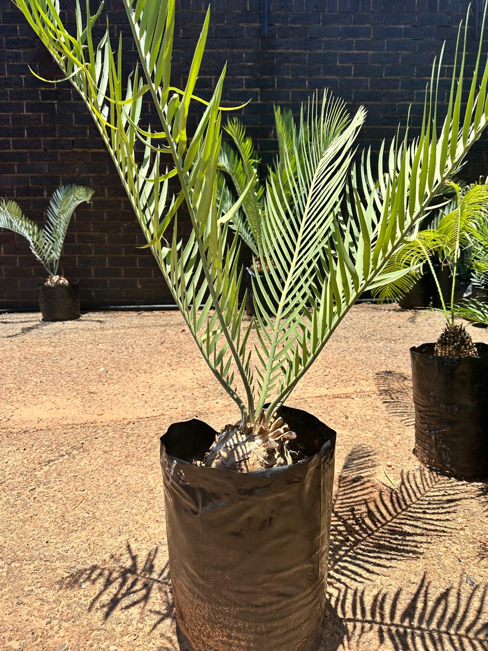 The stems of the Lowveld cycad are thick and robust, growing up to 40 cm in diameter. The surface is covered with small leaf-base scars, giving it a rough texture. The plant often produces suckers from the base, forming clumps of 3-4 stems. The crown of the stem is densely packed with bracts, providing protection from the environment. This species grows in exposed rocky outcrops, with older plants sometimes draping over rocks. The stems are covered with grayish or buff-colored woolly bracts.