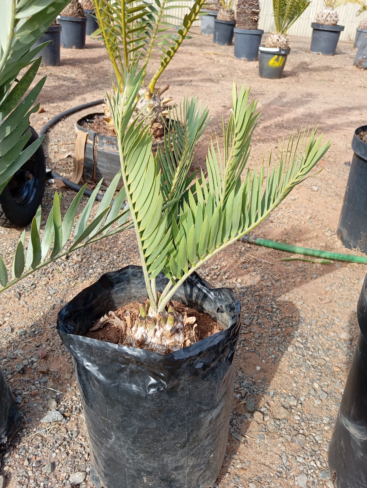 Female E. altensteinii plants produce 1-5 cones per crown. These cones are large, about 45-50 cm long and 25-30 cm in diameter, and have a distinct yellow color with a textured surface covered in fine, golden hairs. The seeds are orange-yellow. Male cones are smaller, measuring 40-50 cm in length and 12-15 cm in diameter. Up to three cones are produced per crown, although it's rare to see that many at once. The cones are borne on a peduncle up to 10 cm long.Both male and female cones of C. thouarsii are produced once per year. Female cones are 10-12 cm in diameter, borne on short peduncles, and green or red-brown when mature. Male cones are smaller, cylindrical, 15-20 cm in length, and covered with a fine woolly layer. They are attached to short peduncles. Both cones remain on the plant for several months before releasing seeds. Pollination is primarily wind-driven, but insect activity also plays a role, particularly in Madagascar populations.Female cones of the Waterberg cycad are large, egg-shaped, and typically 30-50 cm long and 16-20 cm broad. These cones are green at first, turning yellow as they mature. Male cones are smaller, subcylindrical, around 20-40 cm long and 6-8 cm in diameter, covered in fine brown hairs. Cone production is infrequent, with only a few cones appearing every few years. The cones, particularly in cultivated environments, may produce up to six cones per crown, though the typical production is much lower in the wild.