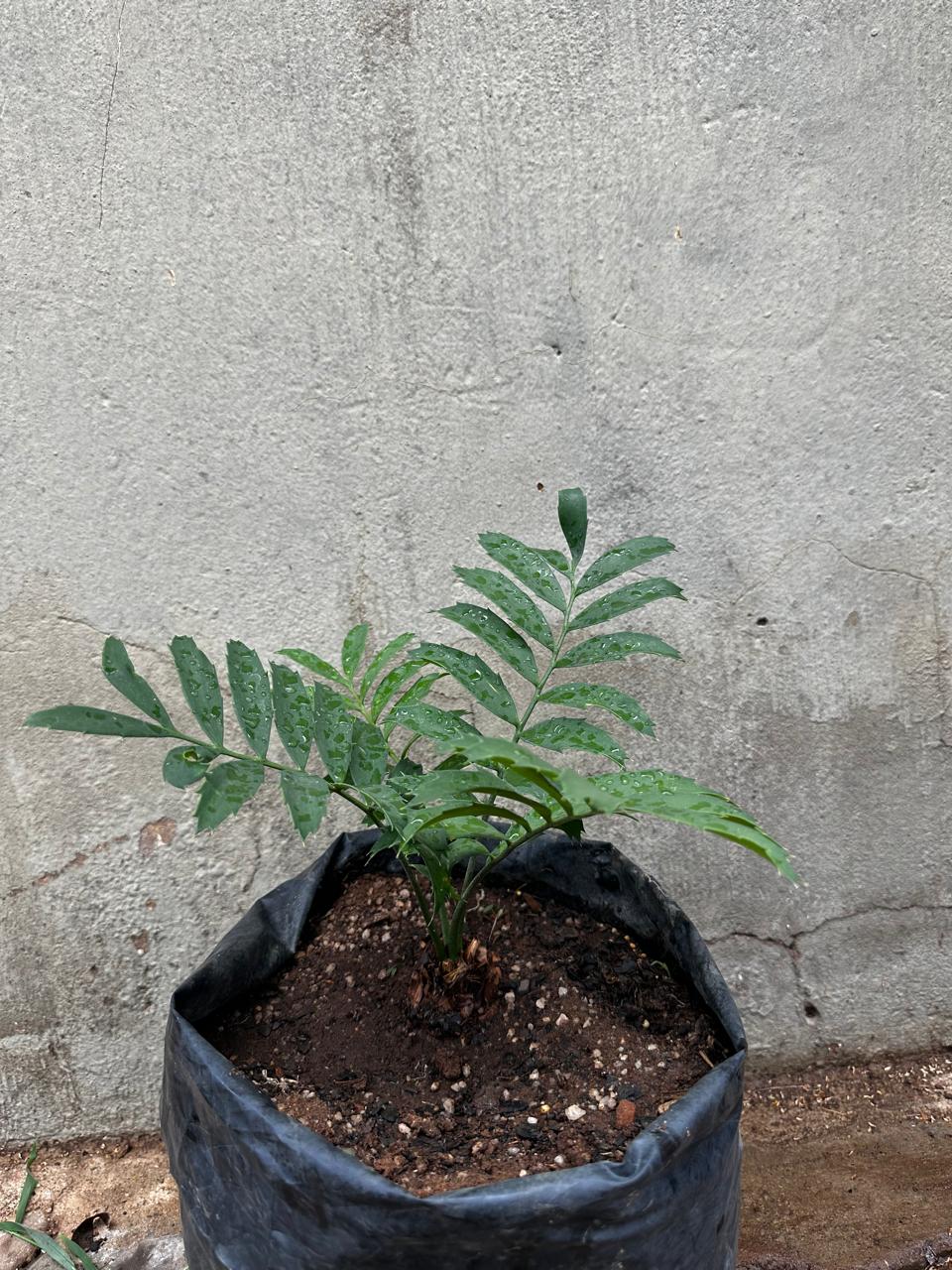 The dark-green leaves of Encephalartos ferox are 1-2 meters long, straight, and spread outward, with a noticeable downward curve at the tip. Freshly sprouted leaves are covered in fine hairs, but these disappear as the leaves mature. Median leaflets are about 15 cm long and 3-5 cm broad. Each leaflet bears 2-4 medium-sized teeth on the upper and lower margins, with larger triangular lobes at the apex. The lobes are distinctly twisted, giving the leaflets a rugged, fierce appearance, matching the species' name.